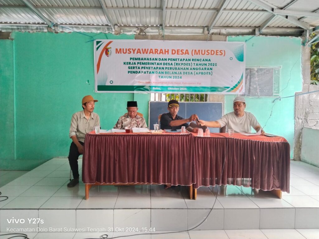 Desa Bobo, 31 Oktober 2024 — Pemerintah Desa Bobo menggelar Musyawarah Desa (MUSDES) dalam rangka membahas dan menetapkan Rencana Kerja Pemerintah Desa (RKPDes) Tahun 2025, serta Penetapan Perubahan Anggaran Pendapatan dan Belanja Desa (APBDes) Tahun 2024.